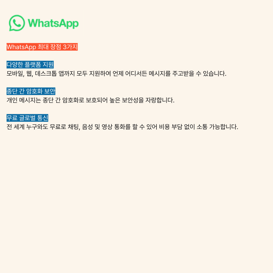 왓츠앱(WhatsApp) 장점 5가지 요약문 (300자 내외): 왓츠앱(WhatsApp)은 광고 없는 깔끔한 UI와 강력한 보안(엔드투엔드 암호화)으로 안정적인 메시징 서비스를 제공합니다. 전 세계 사용자와 무료로 채팅 및 통화를 할 수 있으며, 다양한 기기에서 연동이 가능합니다. WhatsApp 하나면 글로벌 소통도 문제없어요!